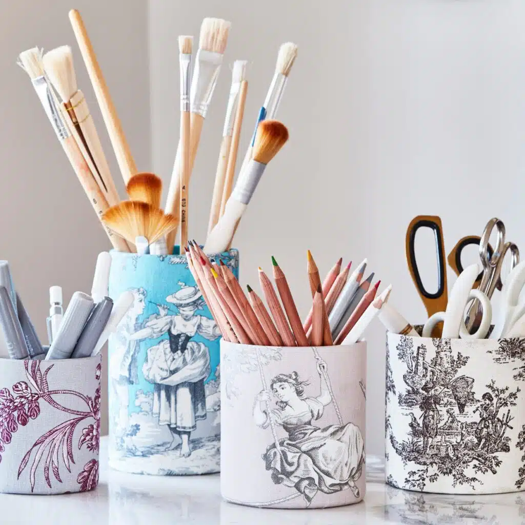 According to a this article on Martha Stewart’s website, decorating your desk accessories adds, “joie de vivre. Simply cover recycled metal cans or glass vases with romantic French-toile fabric in a few pretty patterns, and drop in your daily tools. Easy organization and inspiration.” Now that’s what we call stunning.